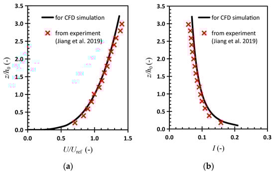 Wind characteristics of approaching flow for computational fluid dynamics CFD simulation: (a) velocity U; and (b) turbulent intensity I distributions.