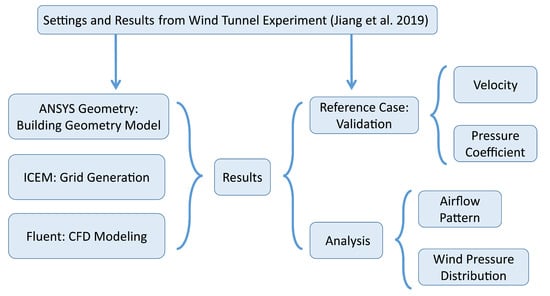 Wind-induced physical fields are investigated based on four methods, including theoretical analysis, in-situ field measurement, wind tunnel experiment and computational fluid dynamics (CFD) technology. In-situ field measurement of full-scale buildings investigates wind fields under real conditions, where all building surroundings are taken into account [,,,,,]. Wind tunnel experiments, with reduced-scale models, can provide data under controlled laboratory conditions. In addition, wind tunnels have advantages for investigating specific parameters, such as wind direction and turbulent intensity [,,,]. Theoretical analysis methods, based on fluid mechanisms, aim to develop analytical solutions with mathematical formulations [,,,]. Numerical simulation methods, based on CFD, are used to simulate both full-scale and reduced-scale wind environment to obtain a wider range of data [,].