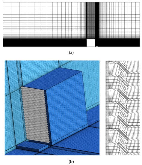 The computational domain around the studied building is demonstrated in Figure 6. Two standards were used to define the scales of the computational domain [,], and the blockage ratio is below 3%. The minimum heights of the near-wall grids on the ground, building walls and shading louvers were 0.0003 m (0.0006h0). Note that the near-wall grids are just the wall-adjacent grids closed to the solids, rather than all grids between two adjacent louvers. In near-wall boundary layers on these surfaces, enhanced wall treatment is applied for y+ < 5 and y+ ≈ 1 []. Figure 7 shows the grid resolution in computational domain and around the cubic building. Compared with published research of a building with louvered windows [], we had much higher grid density along louver length but lower grid density along louver width, because in our pre-simulation, it was found that in the study of wind pressure coefficient, the deviations were mainly caused by the grid density along louver length, rather than that along louver width. Based on the grid resolution, a coarser mesh and a finer mesh were created to ensure grid accuracy. The Grid Convergence Index (GCI) [,] was calculated to show the deviation between different mesh sizes. For the reference case, GCI of normalized velocity and wind pressure coefficient are 0.37% and 1.8%, which are small enough to ensure grid accuracy, as recommended by Vinchurkar and Longest [].