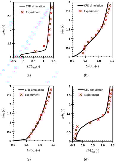 Comparison of normalized velocity U/Uref distribution around the building on the measurement line: (a) 2.5h0, (b) 1.5h0, (c) 0.5h0 and (d) −0.5h0.