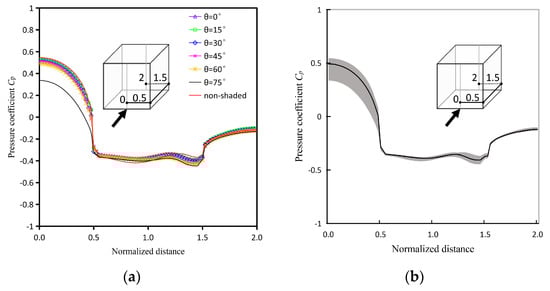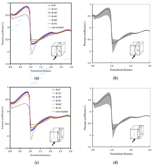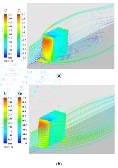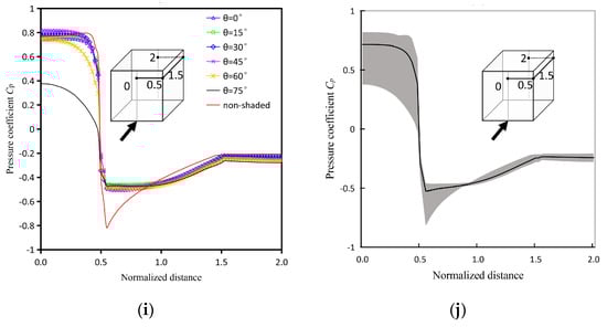 Figure 10 shows airflow streamlines around the building and wind pressure distribution on the building surfaces under the shaded condition with θ = 45°. In Figure 10a, the approaching flow towards the central rows was separated into three regions: Stagnation zone on the windward facade at about 0.7h0, the upward flow near the roof and the downward vortex near the ground. The streamlines were smooth above the small reverse flow on the roof. The larger reverse flow and the recirculating zone were generated on the lateral façade, and the leeward facade, respectively. In Figure 10b, the airflow streamlines towards the side rows were smoother than that towards the central rows, which demonstrates that the airflow pattern was almost not affected by the detailed geometry of the shaded building.