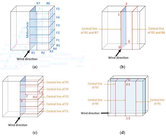 The windward, lateral and leeward facades are divided into seven equal rows and five equal floors to ensure that the outside surfaces of rooms have the same area in the same direction. The rows are marked from R1 to R7, and the floors are marked from F1 to F5, as shown in Figure 11a. Note that the area for calculation is half of the real area for R1 and R7, considering the usage of the symmetry building model and symmetry domain in simulations. The distribution of wind pressure coefficient are investigated on two W-R-L lines, five W-S-L lines and three R-S lines. All these lines are located on the center of their rows or floors, which are also shown in Figure 11b–d. The impact of shading louvers with various rotation angle θ on Cp at a specific point is evaluated by the range R as shown in Equation (9).