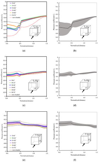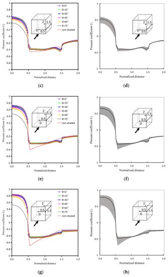 Figure 12a,b present the local range R, local and average value of wind pressure coefficient Cp on the central lines of R1 and R7 along the windward, roof and leeward surfaces under different shaded conditions. Generally speaking, the roof suffers the largest fluctuation of Cp, while the leeward surface has the smallest difference of the local Cp and R along the lines. The maximum and minimum value of Cp are 0.86 and −1.08, respectively. The Cp-max line and Cp-min line have the similar shape and tendency except near the edge of the roof for around 1–1.4h0 where has a flow separation. On the line of the windward facade, the maximum R is at about 0.8–0.9h0 on the stagnation zone and the minimum R is near the edge between the windward and the roof surfaces. The R along these lines increases along 0–0.1h0, but the local Cp decreases. From 0.1h0 to 0.7h0, the local Cp and the R both increase. After 0.7h0, the local Cp in some cases begins to decrease but the R still grows up until around 0.9h0. These results indicate that near the maximum positive Cp on the stagnation zone, the Cp is strongly sensitive to the rotation angle θ of shading louvers. For the area near the vortex at the corner of the windward facade and the ground, the Cp is not sensitive to different shaded conditions. On the lines of the roof, the Cp suffers a sharp decrease near the edge, which is the continuation of the windward surface. Then the R increases to the widest at 1.05h0. In this area, the blocking effect of shading louvers makes the Cp tendency smoother along the roof line. On the leeward line, the local Cp just changes slightly at different points due to the leeward recirculation.