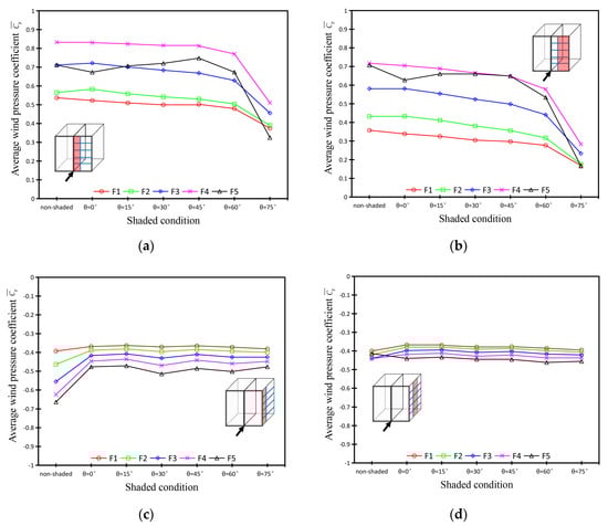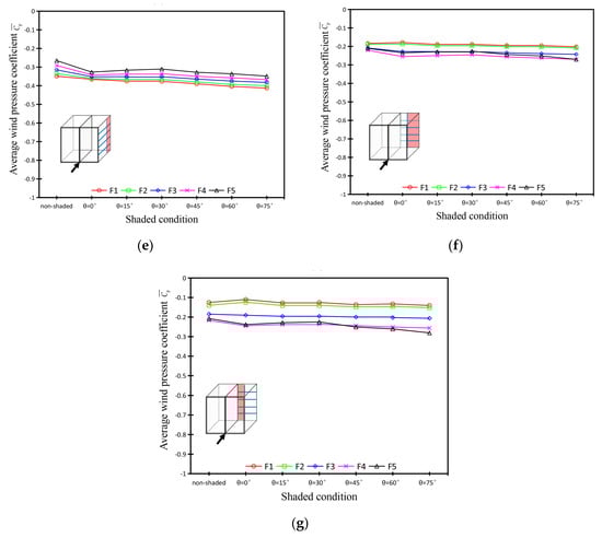 Average wind pressure coefficient on outside surfaces of rooms under different shaded conditions for (a) R1; (b) R2; (c) R3; (d) R4; (e) R5; (f) R6; (g) R7.