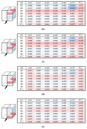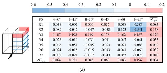 Figure 15 presents on five different floors along R1–R7. Figure 16 presents between the non-shaded condition and other shaded conditions. In Figure 15, the results of R1 and R2 show that the windward surface has the largest difference of on different floors for most shaded conditions. On the windward R1 and R2, F4 has the highest and F1 has the lowest for most shaded conditions. has the greatest reduction for all floors when θ turns from 60° to 75°. For most floors, decreases with a higher θ, except for F5. On the lateral R3, the greatest difference occurs between the non-shaded condition and the shaded condition for any θ, but does not have much fluctuation when θ changes. The results of R4, R5 and R6 show that the smallest difference of for different floors occurs near the edge between the lateral and leeward surfaces. The results of R4, R5, R6 and R7 show that the impact of shading louvers on can be neglected in some non-shaded facades. In Figure 16, the impact of shading louvers on , which is described as , becomes higher for the higher floors in general. Considering the different rows, R2 and R3 have the largest and the second largest for most floors with the presence of shading louvers. And the impact of shading louvers on is obviously smaller for R4, R6 and R7. With shading louvers, on R3 are larger than those without shading louvers for all floors. And the situation are almost the same on R4 except for F5. But on the most parts of other rows, decreases when shading louvers are installed. For F1, the largest and the second largest occur on R1 and R2. The largest absolute value of occurs on R4 for just θ = 0° and on R2 for the other θ. For F2 to F5, the largest and the second largest occur on R2 and R3. The presence of shading louvers has the largest influence on of R3 for θ = 0°–45° but on of R2 for higher θ.