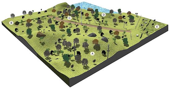 The robotic simulator Gazebo [22] can be employed to obtain realistic point clouds of rough terrain from 3D rangefinders [3,19]. Figure 2 shows a general view of the natural environment generated with Gazebo, whose maximum dimensions are 150 m long, 150 m wide and 20 m high [15]. It contains natural elements like uneven ground, grass, bushes, rocks, trees and water. However, it also has artificial elements like tables, benches, fences, power lines and pavement. Five different zones can be distinguished inside: hills (A), a cave (B), a forest (C), a lake (D) and a park (E).