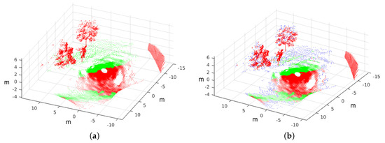 Figure 9a and Figure 10a and Figure 11a show a park, a rural path and an underpass where Andabata has been teleoperated. For each scene, a levelled 3D point cloud with a horizontal resolution of 1.2° and without intensity data has been obtained in 3.75 s [23]. Sky visibility determines the number of points for each laser scan, ranging from 32,795 for the park to 83,183 for the underpass.