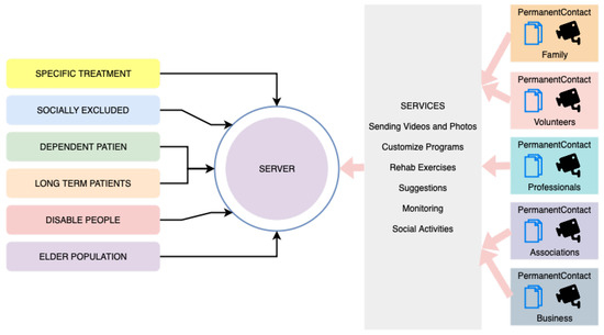 - Provide mechanisms for assistance to the user by professionals, relatives or friends in different fields, such as the distribution of multimedia contents, videos, pictures, articles, etc.