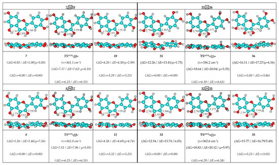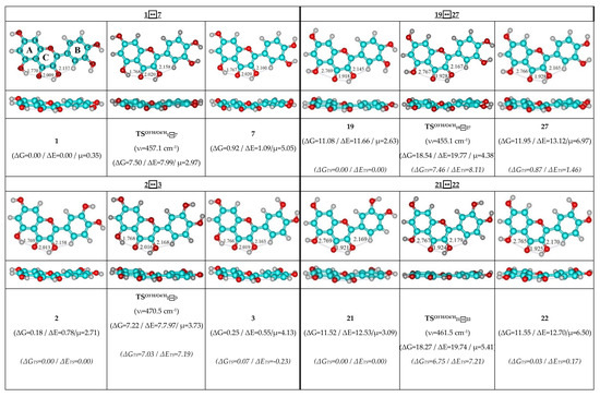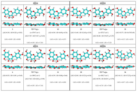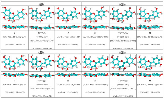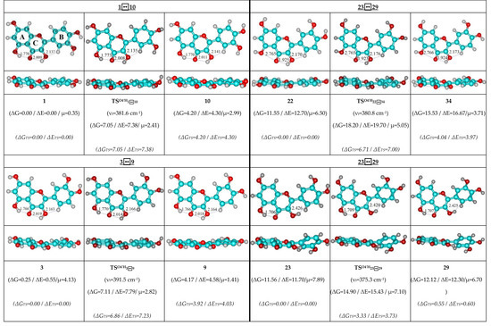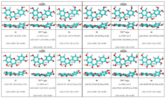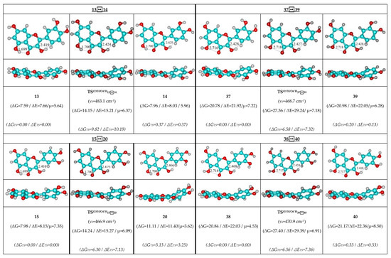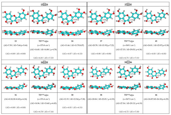 Therefore, detailed analysis of the obtained results enabled us to obtain the following observations and their discussion. As individual, the concerted rotational transitions of the O3′H and O4′H hydroxyl groups proceed through the mirror-symmetrical pathways, which are controlled by the mirror-symmetrical TSs. Totally, we have revealed 48 TSs—16 TSs in each case (Figure 1, Figure 2 and Figure 3; Table 1, Table 2 and Table 3).