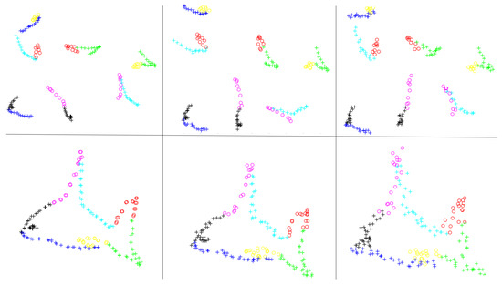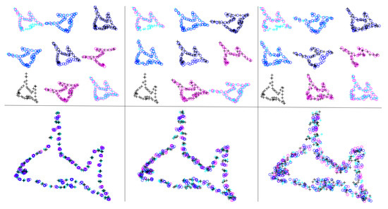 To further demonstrate the generality of our algorithm, we investigated whether our algorithm was able to simultaneously align several point sets with small partial overlaps. As shown in Figure 2, unlike the first experiment, in which a complete fish shape was sampled, in this experiment, we sampled only a part of the fish at one time, resulting in eight point sets that partially overlap the adjacent point sets. Similar to the previous example, the correspondences are denoted by points with the same color and shape. The first and last point sets completely overlap; therefore, their relative positions do not need to be adjusted. We also added random noise proportional to the coordinates of each point to simulate real scenes. The experimental result is shown in the second row of Figure 2. These results show that, even when partial overlaps exist, our algorithm still achieves fine registration and is robust to noise.