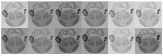 An example of the correspondences we extracted (marked by red dots). We utilized the SIFT flow method to obtain dense correspondences between adjacent images; then, from those, we selected a sparse set of pairs with low matching errors. The two rows show adjacent images. Clearly, our approach can obtain reliable correspondences even under conditions that involve illumination variation, tissue removal, and spatial transformation.