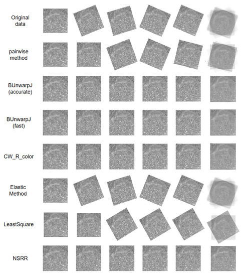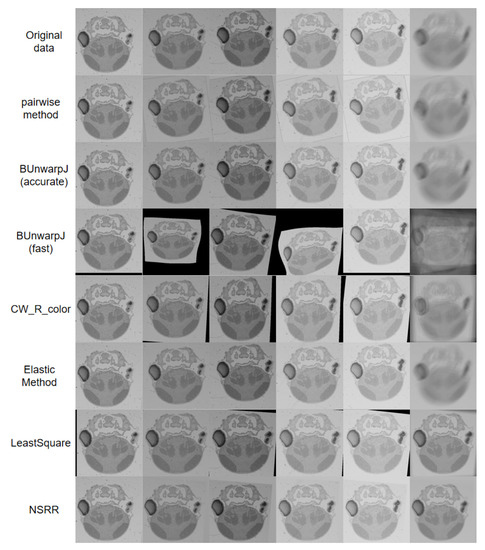 To test the proposed algorithm’s applicability to real-world scenes, we first used our noniterative simultaneous rigid registration algorithm (NSRR) to register serial section images of a zebrafish, which included 336 microscopic images imaged by scanning electron microscopy (SEM). The thickness of each section is 50 nm, the image resolution is 6144 by 6144 pixels, and the pixel size of the images is 110 nm. This problem involves different levels of rotation, translation, scaling, and nonlinear deformation. All the experiments were run on the same PC equipped with an intel i7-4790 CPU. Baseline methods’ programs are publicly available in Fiji (the software can be downloaded from: https://imagej.net/Fiji and http://www-o.ntust.edu.tw/~cweiwang/3Dregistration/).