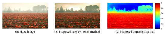 In recent years, self-driving vehicles, underwater robots, and remote sensing have attracted attention; such applications employ fast and robust image-recognition techniques. However, images of outdoor or underwater scenes have poor image quality because of haze (Figure 1a), thus affecting image recognition. To solve this problem, many haze removal techniques were proposed, and these techniques can be classified into non-learning-based and learning-based approaches.