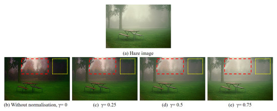 The histogram (Figure 3) of the transmission map derived by the proposed method shifts towards the right side compared with the histogram of transmission map without normalisation. As a result, the histogram of the proposed method gets close to the original patch-wise DCP. Here, if is set to be 0, Equation (9) corresponds to the pixel-wise DCP without normalisation (Figure 2b). Furthermore, setting to be a small value (e.g., 0.25) results in a dark image within the yellow dotted rectangle (Figure 2c), but if is set to be a large value (e.g., 0.75), the haze-removal effect diminishes within the dashed red rectangle (Figure 2e).