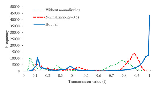 In the DCP, the spatial resolution of the transmission map worsens along object edges because of calculating spatial minimisation in a dark-channel image. Therefore, He et al. [5] refined the transmission map via image-matting processing [14]. However, image-matting processing requires a high computational cost and is not acceptable for real-time application. Therefore, they proposed a guided-image filter [7] as a fast image-matting technique. Other researchers also proposed a pixel-wise DCP [15,16,17] and a method combining original patch-wise DCP in a flat region and pixel-wise DCP around the edge region [18]. Although pixel-wise DCP can estimate the transmission map without selecting a minimum value spatially, the result tends to be darker than the haze image (Figure 2b). The histogram of medium transmission in Figure 3 shows that the pixel-wise DCP without normalisation shifts to the left side compared with the histogram of the original patch-wise DCP (He et al. [5]). This is why the of Equation (4) cannot be zero by setting the patch size to instead of . Therefore, in the proposed method, the of Equation (4) has a small value; the value of () is defined by multiplying normalised dark channel of haze image , which ranges from 0 to 1 and the ratio in Equation (8).