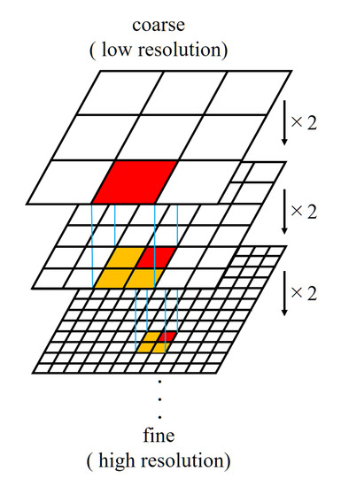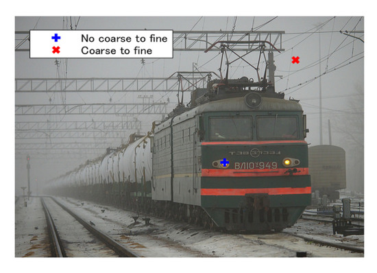 He et al. [5] estimated atmospheric light using the original patch-wise DCP, which is a robust method because it ignores small white objects by using a large patch size (e.g., ). In addition, Liu et al.’s method [19] segments the sky region and uses the average value of that region as atmospheric light . In our proposed method, because the dark-channel image is calculated for each pixel, white regions (represented by the blue ‘+’ mark in Figure 5) are misinterpreted as atmospheric light . On the basis of Figure 5, we found that our proposed method cannot use the He et al. [5] approach directly. In addition, their method requires extra computation time for sorting the top brightest pixels in the dark channel of haze image . To solve this problem, we propose a method that robustly estimates atmospheric light by using a coarse-to-fine search strategy. Figure 6 shows the flow of the coarse-to-fine search strategy. In this strategy, initially the resolution of the dark-channel image is reduced step by step and the position of the largest dark-channel value is obtained at the lowest resolution; next it recalculates the position of the largest dark-channel value in the second-lowest resolution and continues to recalculate the position of the largest dark-channel value until the original image size is attained. In Figure 5, the red ‘×’ mark (coarse-to-fine search strategy) is the correctly estimated atmospheric light .