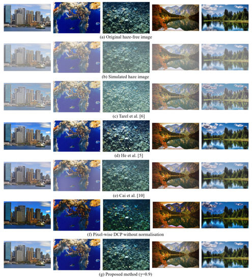 Comparison of proposed method with conventional method using simulated haze images generated with uniform transmission map (). (a) Original haze-free image, (b) Simulated haze image, (c) Tarel et al. [6], (d) He et al. [5], (e) Cai et al. [10], (f) Pixel-wise DCP without normalisation, (g) Proposed method ().