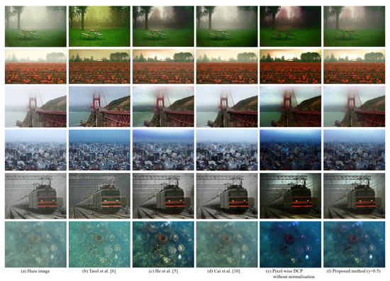 Comparison of haze-removal results by our proposed method with conventional methods applied to actual haze images. (a) Haze image, (b) Tarel et al. [6], (c) He et al. [5], (d) Cai et al. [10], (e) Pixel-wise DCP without normalisation, (f) Proposed method ().