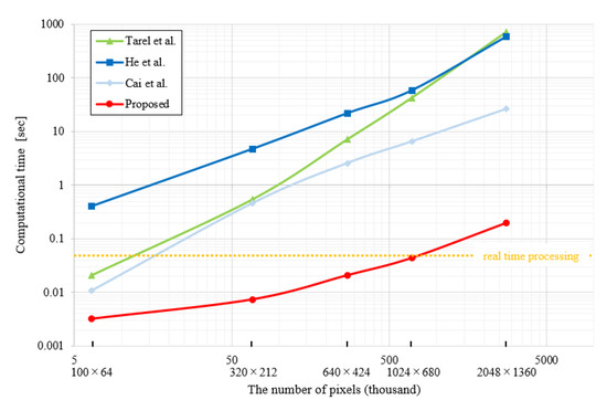 Figure 10 shows computation time for each image size for each method, assuming a i7-5557U (3.1 GHz, 2 cores, 4 threads) without GPU acceleration and main memory size is 16 GB. All methods are implemented in MATLAB. Using conventional methods, it takes several tens of seconds, and they cannot achieve real-time calculation. However, our proposed method can achieve real-time calculation until image size exceeds pixels.
