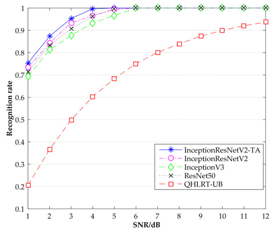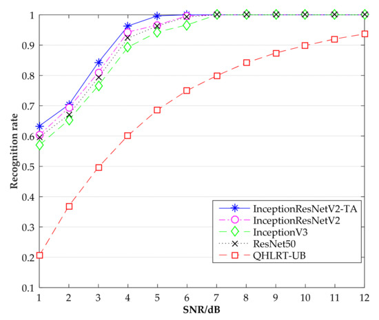 In this paper, the InceptionResNetV2-TA algorithm is used to identify the modulation method of digital signals. At the same time, InceptionResNetV2, InceptionV3, ResNet50 and quasi hybrid likelihood ratio test-upper bound (QHLRT-UB) [35] are selected as comparison methods. The evaluation indicators required for the experiments are the recognition rates of the constellation diagrams of the three signals at low SNR; the five algorithms correspond to the overall recognition accuracy of the three data sets. The experimental results are shown in the figures below.