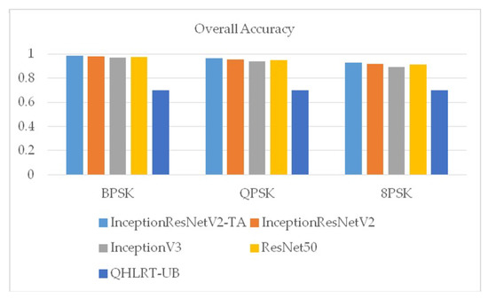 Figure 9 shows the overall recognition rates of the three signals of BPSK, QPSK and 8PSK by the five algorithms. It can be seen from the figure that the overall recognition rates of the three signals by InceptionResNetV2-TA algorithm proposed in this paper were the highest.