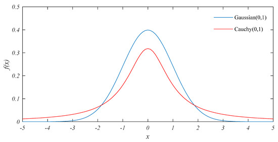 (2) Considering that the Gaussian operator is not sufficient for global search, the Cauchy mutation operator is added in this study. Figure 2 shows the Gaussian and Cauchy distributions. It is evident that the Cauchy distribution drops gently from the peak to the both sides, and a point after Cauchy mutation will be less affected by the local extremum point. In addition, the Cauchy distribution peak is relatively small and the ability for local search is poor, while the opposite is true for the Gaussian distribution.