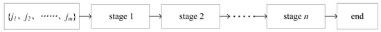 In Figure 3, each stage consists of only one machine. is the processing order of the jobs and is the first job to be processed. All of jobs are completed when the is completed on stage n. The completion time of job on machine k is noted by . The objective of the scheduling is to obtain minimal . The problem is described as:
