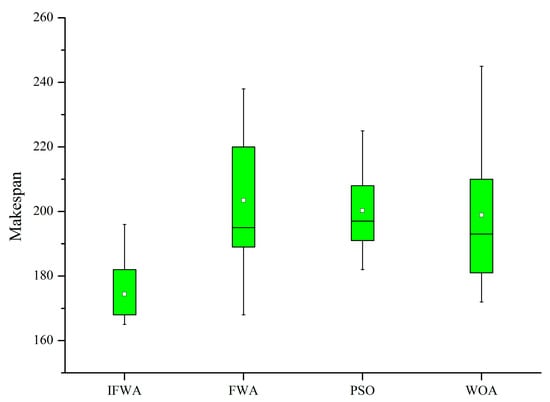 Figure 5 presents the boxplot for the four algorithms when solving this instance from HFSP. It is evident that the obtained optimization results had greater volatility because of the complexity of the HFSP. It is clear that the overall distribution of the results obtained by the IFWA was the most concentrated and the overall makespan was smaller than that of the other three algorithms. Figure 6 shows the optimal curve of four algorithms. It is evident that the IFWA could find the optimal makespan.