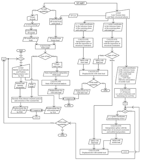 As a preliminary step, a line scan of the unloaded structure is performed, in correspondence with the selected section, which allows to have the reference shape. This shape is given by the best fitting line of the points measured (usually 10 to 100 points per meter at a 100 m distance from TLS). To obtain instant displacements, line scans are performed during the normal activity of the structure, with a sampling rate of up to 120 lines per second. For each line scan, the interpolation line is obtained and the scan time t, provided by the instrument timestamp, is memorized. The displacements at time t, are given by the deviation between the interpolation line at time t and the reference line. These displacements provide the elastic curve due to the load present at time t.