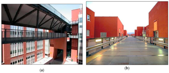 The bridge at the University of Calabria: (a) the pedestrian deck; (b) the upper deck.