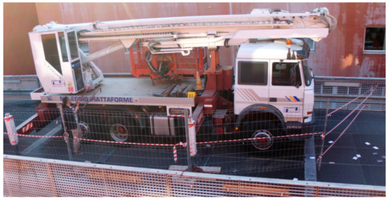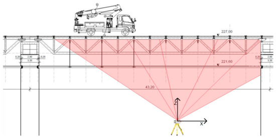 Figure 5 shows the test layout. The test was performed during the parking of a truck elevator, which weight was about 260 kN (Figure 6). The TLS position was chosen below the deck. In this way it was possible to acquire the points of the upper element of the deck structure, realized with a 3D truss. To minimize the oscillations of the rotation axis, the minimum sampling rate was chosen, equal to 70,000 points per second. The distance between the bearings of the bridge is 40.30 m. Measuring the position of the wheel axles, the center of gravity of the truck was obtained, located 11.07 m from the south support.
