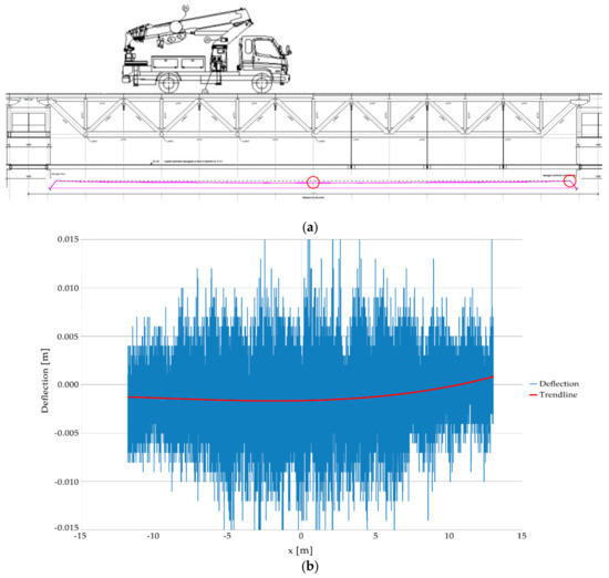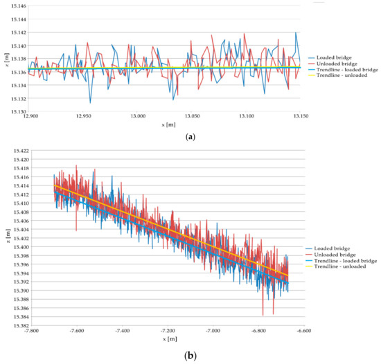 Figure 7a shows, on an arbitrary scale, a view of the entire span and of the lines obtained with the bridge loaded and without loads. The origin of the reference system is the center of TLS. One can observe that the deck has a vertical displacement, with respect to the horizontal direction, of about 134 mm in the middle of the span, with only the dead load. The circles indicate the enlargements shown in Figure 8. Figure 7b shows the deflections due to the truck load, obtained from raw data and the trend-line. In this case, a cubic polynomial, of the type described in Equations (4) and (5), provides an effective fitting line.