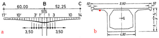 The bridge’s Cross Sections at the bearings: (a) transversal; (b) longitudinal.