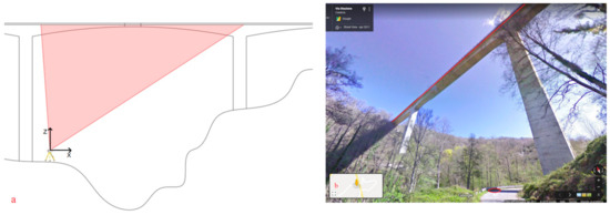 A station point for VZ1000 TLS was chosen, aligned with the central axis of the bridge. The chosen location is in a stable area and is about 90 m from the anchorage of the rods. This position allows a vertical section of the pylon to be described with the laser beam of the instrument. In particular, the outer part of its cylindrical surface with elliptical section is detected. The rods hidden only a short stretch of the pylon. In this way, we can get the elastic line of the pylon for each line scan, during the runs of the trucks used as mobile loads.