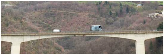 The unloaded bridge acquisition was carried out from 11.33 am to 11.35 am local time (UTC + 1). The acquisition with mobile loads was carried out from 10:41 UTC (GPS time 1,200,220,888) to 10.51 UTC (GPS time 1,200,221,500). The sampling rate was 120 lines per second. This acquisition began before the first truck left and continued until before the departure of the fourth truck. The scans were then stopped due to the heavy rain, so the runs of the last vehicles were not acquired. The trucks were equipped with Leica GS15 GNSS receivers, mounted on a solid magnetic base that allows them to be fixed to the cab roof.