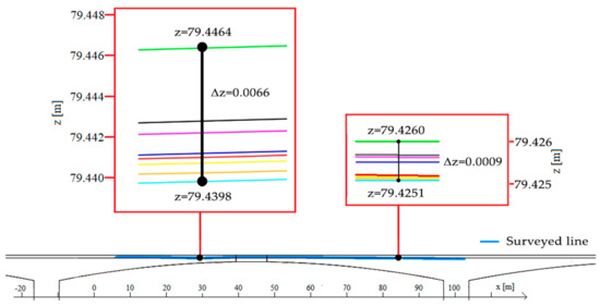 Figure 19 shows some test results. The magnifications correspond to the areas circled in blue in the thumbnails. The point cloud of the profile acquired with the unloaded bridge is in blue.