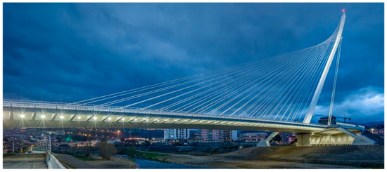 It is a cable-stayed bridge with a cantilever spar. The characterizing structural element is the single inclined pylon, which with its height of 95 m marks the surrounding landscape. The span, 200 m long, is counterbalanced by twenty twin cable lengths. Two large rods contrast the actions of the cables. A special feature of the bridge is the upper part of the pylon, where the cables are anchored so as to give the impression of a sail. The metal structure of the deck rests on artistically sculpted concrete abutments.