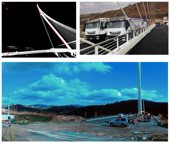 The experiment was performed during the official load test carried out on 17 January 2018, a windy day; a series of trucks of known weight were placed on the deck (Figure 17b).