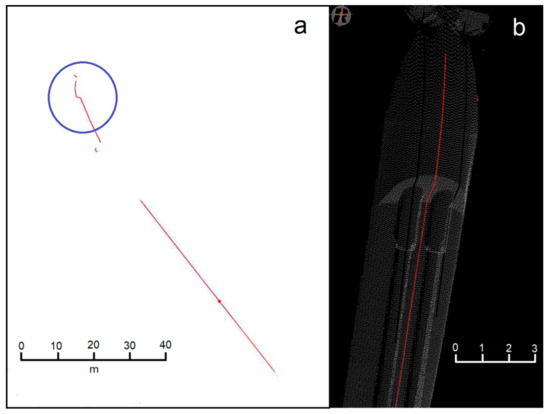 Figure 17a shows the layout of the test. On the left side of the panel, you can see the TLS station. The laser trace is highlighted by a red line. Figure 18a shows a vertical section extracted from a line scan. Figure 18b shows the point cloud obtained for the pylon head. Overlaid you can see the upper part of the laser track, circled in blue in Figure 18a.