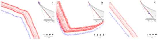 Enlargements of the point clouds obtained before the load test (blue points) and during the test (red points): (a) Upper zone of the pylon (z = 81 m); (b) Constraint device in which the rods can slide (z = 69 m); (c) lower part of the pylon (z = 39 m).