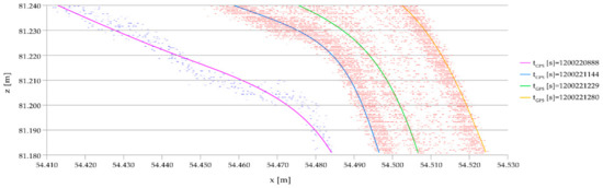 Figure 20 shows a stretch of four splines, obtained for different instants, in the upper zone of the pylon. The coordinates are referred to the center of the instrument, so x is the horizontal distance and z is the difference in height with respect to the center of the TLS. The magenta line (GPS TIME 1200220928) is related to the unloading bridge. The other lines relate to the parking of the first truck (blue line), the parking of the second truck alongside the first one (green line) and the parking of the first three trucks (yellow line). From the data collected it is possible to extract the movements of the pylon, at each height, as a function of time.