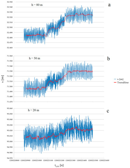 Horizontal displacements, as a function of the GPS time, for three points of the pylon during the test: (a) at 80 m above the TLS; (b) at 50 m above the TLS; (c) at 20 m above the TLS. Ordinates are the horizontal distances from the TLS.