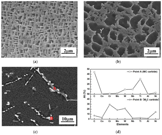 Apart from the precipitation of γ′, there is a large number of carbides which form in the ID after heat treatment. The BSE SEM image shown in Figure 1c reveals that these carbides have different contrast and can be classified into two types. Based on the Energy Dispersive X-ray spectroscopy (EDS) analysis, one can be identified as an MC-type carbide, which is rich in Ti, Nb, and W. The other is M6C, which is rich in Mo, W, and Cr. Both of these carbides contribute to the high temperature strength of K465 alloy during creep. Due to the variation in chemical composition, these carbides exhibit a different contrast in the BSE micrograph. To further confirm the type of carbides, the chemical composition of these carbides was analyzed by EPMA, the result of which is shown in Figure 1d. This observation indicates a good agreement with the carbides analysis reported in previous studies [26,27].