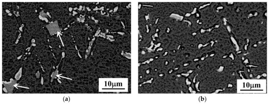 SEM micrographs showing the carbides distribution in the sample with precrept strain of 0.07(a) before RHT and (b) after RHT. Arrows indicate the blocky MC carbides.