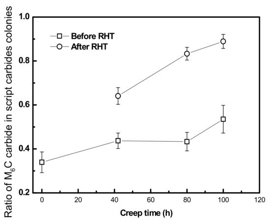 The carbide transformations before and after RHT were also examined in different samples. The SEM micrographs shown in Figure 8 provide one typical example for revealing the carbide transformation in the sample with precrept strain of 0.07. In Figure 8a, the blocky MC carbides can be easily found in the ID region, which is indicated by the arrows. However, the MC type carbides were almost absent after RHT in the same sample, as can be seen in Figure 8b. This implies that the MC type carbides transformed into M6C carbides during RHT. The dissolution temperature for MC carbides is above 128 °C according to the differential thermal analysis (DTA) results. Therefore, it is unlikely that RHT in the present study induced the dissolution of MC carbides but rather enhanced their decomposition. To quantitatively evaluate the transformation of carbides, the ratio of area fraction of M6C carbides to the total area fraction of carbide colonies within five inspected areas was measured by an image analysis approach. The result is summarized in Figure 9. It can be seen that the ratio of M6C carbides was increased gradually during the creep test. With the subsequent RHT, the ratio of M6C carbides significantly increases. This result demonstrates that MC type carbides will continuously transform into M6C type carbides with the thermally-aided diffusional process. RHT cannot reverse the carbide transformation.