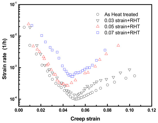 To evaluate the effectiveness of RHT, all precrept samples after RHT were creep-tested again at the same creep condition. The creep strain vs. strain rate curves of different samples are shown in Figure 11. The creep rupture time and minimum creep rate of samples with different accumulated strain are summarized in Table 2. From this result, we can see that the creep strain rate of all samples firstly declines to a minimum value and then rises with the increase of creep strain. This phenomenon can be explained by the movement of dislocations, namely, the mobile dislocation density and velocity of dislocations. It is of interest to note that the minimum creep strain rate of RHT samples is strongly dependent on the precrept strain. For instance, the strain rate curve of the sample with precrept strain of 0.03 is analogous to the sample with an unaltered initial microstructure. The minimum creep strain of these two samples is also found to be similar. With the increase of precrept strain, there is an apparent increase in the minimum creep strain rate when the RHT samples are crept again. On the other hand, the minimum creep rate is reversely proportional to the creep rupture time, which can be rationalized by the Monkman–Grant empirical relationship [31].