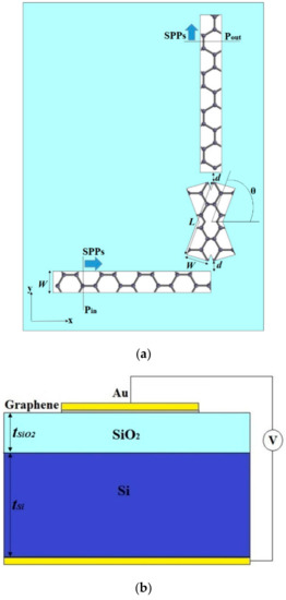 Two-dimensional top and side views of the proposed graphene plasmonic MIR resonator are shown in Figure 1a,b. The structure is composed of a cross-shaped resonator embedded between the horizontal input and vertical output graphene waveguides. The whole structure is placed on SiO2/Si. SiO2 is used as a buffering layer and it has significant influence on the transmission spectrum of the proposed MIR resonator. Previous studies have reported that the thickness of SiO2 cannot be lower than 50 nm due to the invariant transmission caused by the fabrication errors and faults [49,50]. Two Au electrodes are used for applying the bias voltage to graphene in the proposed concept.