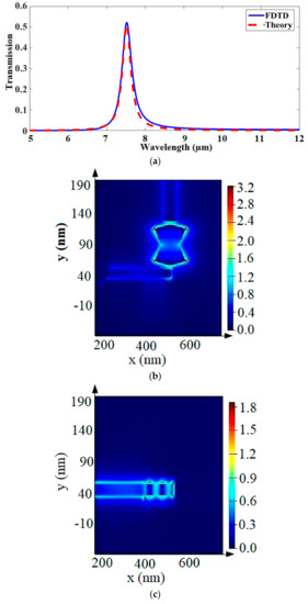 Transmission spectrum of the MIR graphene plasmonic resonator of Figure 1 obtained by numerical FDTD and theoretical CMT methods are given in Figure 2a. For the transmission spectrum which is obtained by CMT method, Qw and Qi are respectively considered as 40 and 100. Field profiles of the resonator for the resonance wavelength of λ = 7.5 µm and the non-resonance wavelength of λ = 6.5 µm are respectively given in Figure 2b,c. The SPPs are excited by use of a dipole point source with electric polarization which is considered 2 nm above the horizontal input graphene [55]. In the resonance wavelength, the incident lightwave couples effectively to the resonator and then, it decouples to the output graphene waveguide. In the non-resonance wavelength, the incident lightwave cannot couple to the resonator and it is blocked.