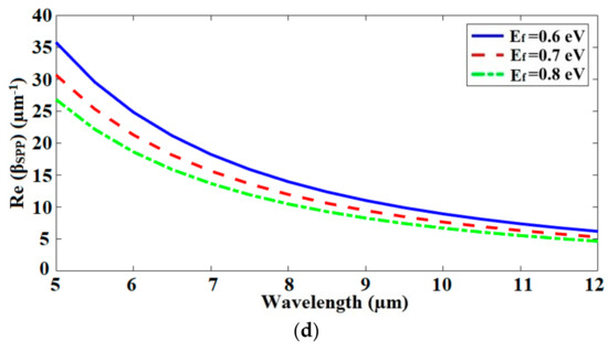 By increasing of Ef, as shown in Figure 3b, the resonance wavelength decreases causing a blue shift. It is because the real part of the βSPP (Equation (4)) decreases as the Ef increases (given in Figure 2d). At the same time, the losses of the SPP wave supported by the graphene layer decrease with the Ef increase. Therefore, the transmission of the transmission peak increases with the Ef increase, also discussed in [57,58].