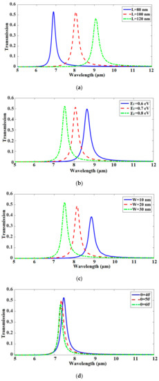 Transmission spectra of the proposed graphene plasmonic resonator of Figure 1 for three different values of the resonator length L, the Fermi energy Ef, the resonator width W, and the angle between the ribbon and the horizontal line of the cross-shaped resonator θ are simulated and given in Figure 3a–d, respectively.
